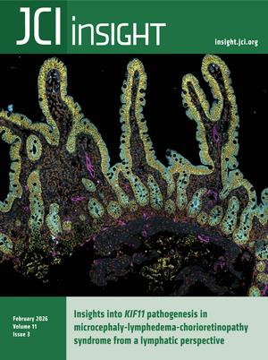 Ogmen et al. report clinical features and disease mechanisms in patients with microcephaly-lymphedema-chorioretinopathy with KIF11 pathogenic variants, focusing on lymphatic function. The cover image shows confocal immunofluorescence microscopy of a paraffin section of human duodenum from a patient with a KIF11 variant. E-cadherin labels epithelial cells in yellow, PDPN marks lymphatic vessels in magenta, CD31 visualizes blood vessels in cyan, and nuclei are shown in orange. Image credit: Pia Ostergaard, Kazim Ogmen, Silvia Martin-Almedina, Felix Heymann, Rose Yinghan Behncke, and René Hägerling.