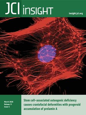 Li et al. report on nuclear and cytoskeletal defects that mediate stem cell–associated osteogenic deformities in a mouse model of a premature aging disorder caused by mutations in prelamin A. The cover shows filamentous actin (F-actin, red) outlining the cellular architecture of calvarial osteoprogenitor cells, with nuclei counterstained by DAPI (blue). Image credit: Kai Li and Wei Hsu.