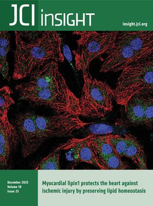 Guo et al.report that lipin1 plays a protective role in the heart following ischemic injury via preservation of lipid metabolism in ischemic cardiomyocytes. The cover shows neonatal rat cardiomyocytes (red) treated with stearic acid. Lipid droplets were stained with BODIPY (green), and nuclei were stained with DAPI (blue). Image credit: Jiaxi Guo.