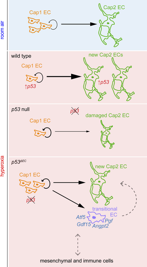Bronchopulmonary dysplasia (BPD), a prevalent and chronic lung disease affecting premature newborns, results in vascular rarefaction and alveolar simplification. Although the vasculature has been recognized as a main player in this disease, the recently found capillary heterogeneity and cellular dynamics of endothelial subpopulations in BPD remain unclear. Here, we showed that Cap2 cells were damaged during neonatal hyperoxic injury, leading to their replacement by Cap1 cells, which, in turn, significantly declined. Single-cell RNA-Seq identified the activation of numerous p53 target genes in endothelial cells (ECs), including Cdkn1a (p21). While global deletion of p53 resulted in worsened vasculature, EC-specific deletion of p53 reversed the vascular phenotype and improved alveolar simplification during hyperoxia. This recovery was associated with the emergence of a transitional EC state, enriched for oxidative stress response genes and growth factors. Notably, this transitional EC gene signature was conserved in an aberrant capillary population identified in human BPD with pulmonary hypertension, underscoring the biological and clinical relevance of our findings. These results reveal a key role for p53 in maintaining endothelial lineage fidelity during pulmonary capillary repair following hyperoxic injury and highlight the critical contribution of the endothelium to BPD pathogenesis.