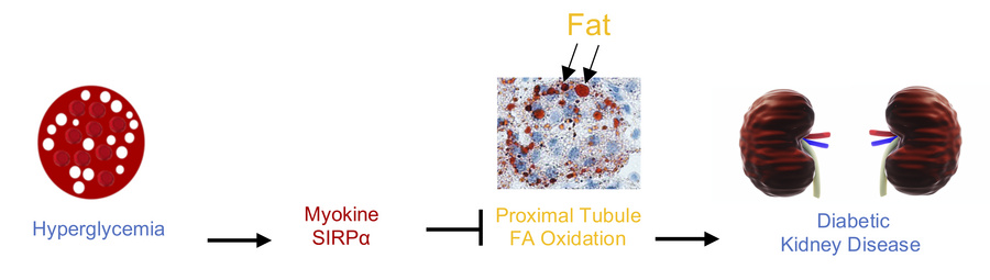 Mechanisms responsible for skeletal muscle kidney crosstalk have not been defined. We have determined that a circulating mediator, signal regulatory protein α (SIRPα), impairs intracellular insulin-mediated functions. To elucidate the effect of myokine SIRPα on diabetic kidney disease (DKD), flox mice and muscle-specific (m-specific) SIRPα-KO mice were subjected to an obesity-induced model of diabetes, high-fat diet (HFD; 60%) or insulin-deficient hyperglycemia model, streptozotocin (STZ), and were subsequently exposed to anti-SIRPα monoclonal antibodies. In the obesity-induced diabetic mice, serum SIRPα increased. Genetic deletion of muscle SIRPα protected against obesity and improved intracellular insulin signaling in muscle and adipose tissue, with reduced intramuscular fat deposition when compared with flox mice on HFD. Moreover, mSIRPα-KO mice displayed enhanced kidney tubular fatty acid oxidation (FAO) expression with suppressed intraorgan triglycerides deposition, and importantly, protection against DKD. Conversely, exogenous SIRPα impaired kidney proximal tubular cell FAO, ATP production, and exacerbated fibrosis. Finally, suppressing SIRPα in skeletal muscles or treatment with anti-SIRPα monoclonal antibodies in STZ-treated mice mitigated cachexia, hyperlipidemia, kidney triglyceride deposition, and renal dysfunction in spite of significant hyperglycemia. Importantly, serum SIRPα was upregulated in patients with DKD. In conclusion, SIRPα serves as a potential biomarker and therapeutic target in DKD.