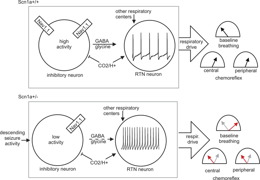 Dravet syndrome (DS) is an early-onset epilepsy caused by loss-of-function mutations in the SCN1A gene, which encodes Nav1.1 channels that preferentially regulate activity of inhibitory neurons early in development. DS is associated with a high incidence of sudden unexpected death in epilepsy (SUDEP) by a mechanism that may involve respiratory failure. Evidence also shows that loss of Scn1a impaired activity of neurons in the retrotrapezoid nucleus (RTN) that regulate breathing in response to CO2/H+, suggesting breathing problems precede seizures and serve as a biomarker of SUDEP. Consistent with this, we showed that Scn1a+/– mice exhibited a blunted ventilatory response to CO2/H+ prior to overt seizure activity that worsened with disease progression. Later in development, some Scn1a+/– mice also showed a blunted ventilatory response to hypoxia. Importantly, the severity of respiratory problems correlated with mortality. We also found that pharmacological activation of Nav1.1 rescued activity deficits of RTN neurons in Scn1a+/– mice. We conclude that disordered breathing may be an early biomarker of SUDEP in DS, and at the cellular level, loss of Scn1a disrupts RTN neurons by mechanisms involving disinhibition and pharmacological activation of Nav1.1 to reestablish inhibitory control of RTN neurons rescues activity deficits.