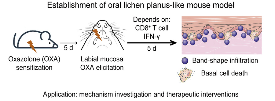 Oral lichen planus (OLP) is a recalcitrant inflammatory disease with potential for malignant transformation, involving a cytotoxic CD8+ T cell–mediated basal keratinocyte apoptosis. However, it lacks an appropriate mouse model for study. Here we developed an OLP-like mouse model using topical oxazolone to induce a delayed-type hypersensitivity-mediated oral lichenoid reaction. Histological and ultrastructural analysis confirmed hallmark pathological features of OLP, including band-like CD8+ T cell infiltration and basal cell damage as well as the presence of Civatte bodies. Comparative transcriptomic analysis revealed significant similarity between RNA-Seq profiles of the mouse model and human OLP lesions, highlighting shared upregulated genes and enriched pathways, particularly those related to IFN-γ signaling and cytotoxic T cell activity. Functional studies demonstrated that the OLP phenotype depended on IFN-γ, with local priming by IFN-γ intensifying the disease through upregulation of major histocompatibility complex class I. Additionally, the absence of Langerhans cells exacerbated disease severity in vivo. Therapeutic evaluation showed that the JAK inhibitors baricitinib and ruxolitinib effectively reduced disease burden and provided mechanistic insights. In conclusion, this OLP-like mouse model recapitulates key immunopathological and transcriptomic features of human OLP, offering a robust platform for dissecting disease mechanisms and evaluating novel therapeutic strategies.