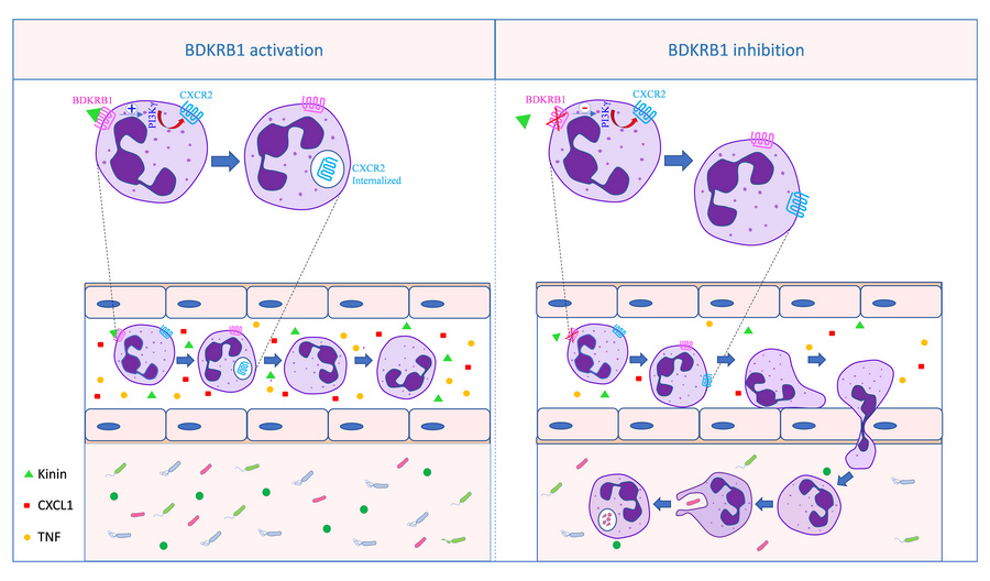 Sepsis is a life-threatening organ dysfunction caused by a dysregulated host response to infection. During early sepsis, kinins are released and bind to B1 (BDKRB1) and B2 (BDKRB2) bradykinin receptors, but the involvement of these receptors in sepsis remains incompletely understood. This study demonstrated that the genetic deletion of Bdkrb2 had no significant impact on sepsis induced by cecal ligation and puncture (CLP) compared to wild-type (WT) mice. In contrast, Bdkrb1−/− mice subjected to CLP exhibited decreased lethality and bacterial load, associated with an increased influx of neutrophils into the peritoneal cavity, compared with WT mice. Neutrophils from CLP-Bdkrb1−/− mice partially restored CXCR2 expression and reduced the upregulation of P110γ observed in WT CLP neutrophils. Pharmacologic inhibition of BDKRB1 combined with imipenem treatment substantially improved survival compared with antibiotic therapy alone. In human neutrophils, stimulation with LPS led to the upregulation of BDKRB1 expression, and antagonism of BDKRB1 restored neutrophil migration in response to CXCL8. These findings identify BDKRB1 as an important modulator of neutrophil dysfunction in sepsis and a promising therapeutic target whose inhibition improves bacterial clearance, restores neutrophil migration, and increases the efficacy of antibiotic treatment.