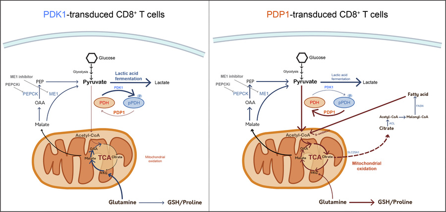 T cells rely on different metabolic pathways to differentiate into effector or memory cells, and metabolic intervention is a promising strategy to optimize T cell function for immunotherapy. Pyruvate dehydrogenase (PDH) is a nexus between glycolytic and mitochondrial metabolism, regulating pyruvate conversion to either lactate or acetyl-CoA. Here, we retrovirally transduced pyruvate dehydrogenase kinase 1 (PDK1) or pyruvate dehydrogenase phosphatase 1 (PDP1), which control PDH activity, into CD8+ T cells to test effects on T cell function. Although PDK1 and PDP1 were expected to influence PDH in opposing directions, by several criteria they induced similar changes relative to control T cells. Seahorse metabolic flux assays showed both groups exhibited increased glycolysis and oxidative phosphorylation. Both groups had improved primary and memory recall responses following infection with murine gammaherpesvirus-68. However, metabolomics using labeled fuels indicated differential usage of key fuels by metabolic pathways. Importantly, CD8+ T cell populations after B cell lymphoma challenge were smaller in both groups, resulting in poorer protection, which was rescued by glutamine and acetate supplementation. Overall, this study indicates that PDK1 and PDP1 both enhance metabolic capacity, but the context of the antigenic challenge significantly influences the consequences for T cell function.