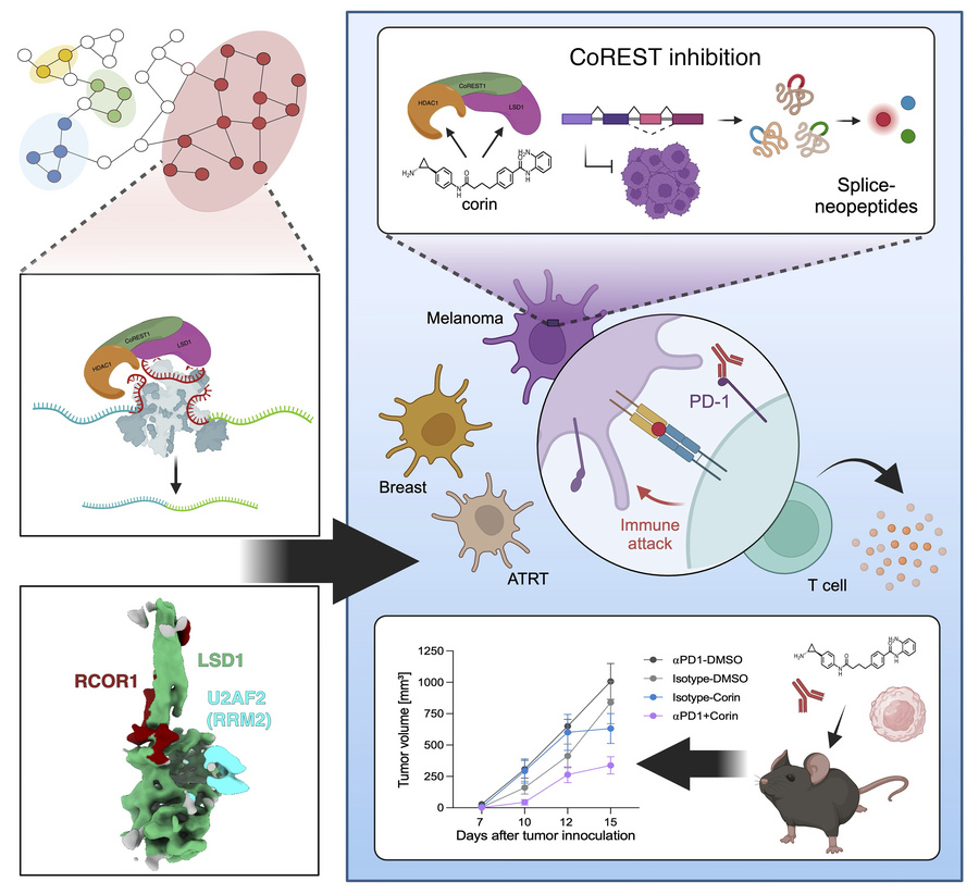 Epigenetic macromolecular enzyme complexes tightly regulate gene expression at the chromatin level and have recently been found to colocalize with RNA splicing machinery during active transcription; however, the precise functional consequences of these interactions are uncertain. Here, we identify unique interactions of the CoREST repressor complex (LSD1-HDAC1-CoREST) with components of the RNA splicing machinery and their functional consequences in tumorigenesis. Using mass spectrometry, in vivo binding assays, and cryo-EM, we find that CoREST complex–splicing factor interactions are direct and perturbed by the CoREST complex selective inhibitor, corin, leading to extensive changes in RNA splicing in melanoma and other malignancies. Moreover, these corin-induced splicing changes are shown to promote global effects on oncogenic and survival-associated splice variants, leading to a tumor-suppressive phenotype. Using machine learning models, MHC IP-MS, and ELISpot assays, we identify thousands of neopeptides derived from unannotated splice sites that generate corin-induced splice-neoantigens that are demonstrated to be immunogenic in vitro. Corin is further shown to reactivate the response to immune checkpoint blockade, effectively sensitizing tumors to anti–PD-1 immunotherapy. These data position CoREST complex inhibition as a unique therapeutic opportunity that perturbs oncogenic splicing programs while also creating tumor-associated neoantigens that enhance the immunogenicity of current therapeutics.