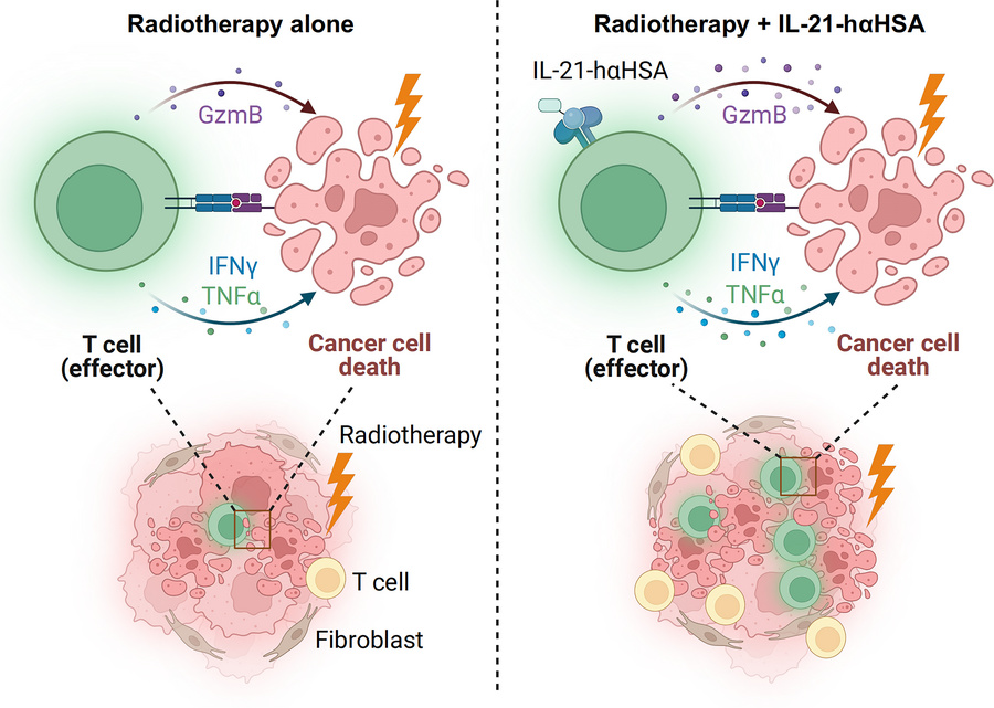 Radiotherapy is a critical modality in cancer treatment, not only to eradicate cancer cells but also to trigger antitumor immunity. IL-21, an immunomodulatory cytokine with potential in cancer therapy, has unexplored synergy with radiotherapy. Our study, leveraging human cancer databases and tissue microarrays, identified a positive correlation between IL-21 and radiotherapy outcomes, particularly in tumor microenvironment (TME) activation. In mouse tumor models, IL-21 combined with radiation significantly enhanced the TME, boosting CD8+ T cell activation and function, reducing tumor burden, and extending survival. Single-cell transcriptome sequencing revealed that the combination of IL-21 and radiation increased the cytotoxicity of effector and memory CD8+ T cells and prevented their exhaustion. These effects were further validated in humanized mice, where IL-21 combined with radiation reduced A549 tumor growth and enhanced CD8+ T cell function. Post-neoadjuvant radiotherapy samples from patients with esophageal cancer showed a positive correlation between IL-21 levels and CD8+ T cell infiltration. Our findings suggest that IL-21 is a promising adjuvant to radiotherapy, potentially improving treatment efficacy through TME enhancement. This study provides a foundation for future clinical exploration of IL-21 for enhancing radiotherapy.