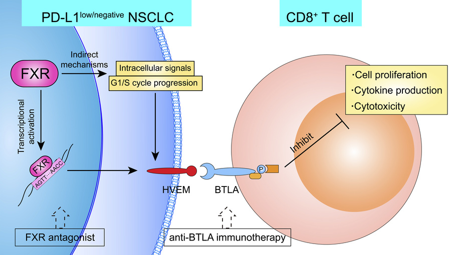 Immune checkpoint therapy has changed cancer treatment, including non-small cell lung cancer (NSCLC). The unresponsiveness of PD-L1lo/– tumors to anti–PD-1/PD-L1 immunotherapy is attributed to alternative immune evasion mechanisms that remain elusive. We previously reported that farnesoid X receptor (FXR) was increased in PD-L1lo/– NSCLC. Herein, we found that immune checkpoint HVEM was positively correlated with FXR but inversely correlated with PD-L1 in NSCLC. HVEM was highly expressed in FXRhiPD-L1lo NSCLC. Consistently, clinically relevant FXR antagonist dose-dependently inhibited HVEM expression in NSCLC. FXR inhibited cytokine production and cytotoxicity of cocultured CD8+ T cells in vitro, and it shaped an immunosuppressive tumor microenvironment (TME) in mouse tumors in vivo through the HVEM/BTLA pathway. Clinical investigations show that the FXR/HVEM axis was associated with immunoevasive TME and inferior survival outcomes in patients with NSCLC. Mechanistically, FXR upregulated HVEM via transcriptional activation, intracellular Akt, Erk1/2 and STAT3 signals, and G1/S cycle progression in NSCLC cells. In vivo treatment experiments demonstrated that anti-BTLA immunotherapy reinvigorated antitumor immunity in TME, resulting in enhanced tumor inhibition and survival improvement in FXRhiPD-L1lo mouse Lewis lung carcinomas. In summary, our findings establish the FXR/HVEM axis as an immune evasion mechanism in PD-L1lo/– NSCLC, providing translational implications for future immunotherapy in this subgroup of patients.