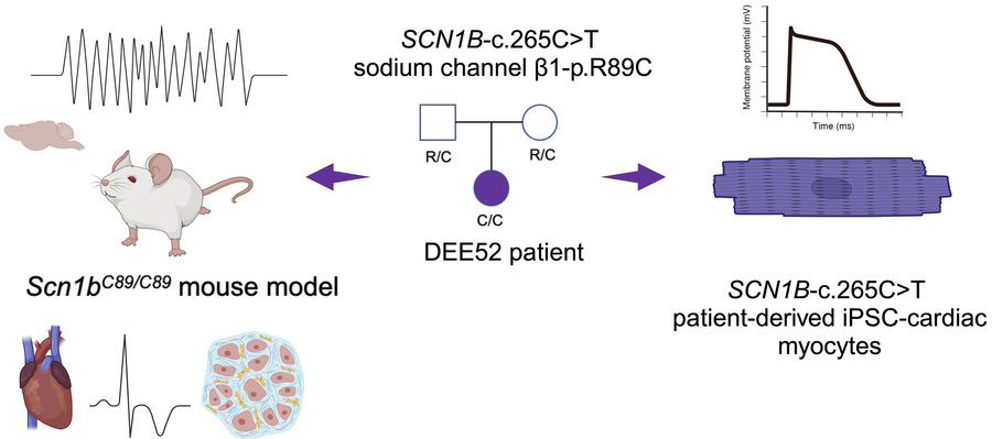 Biallelic variants in SCN1B, which encodes the voltage-gated sodium channel β1/β1B subunits, are linked to DEE52, a developmental and epileptic encephalopathy with a high risk of sudden unexpected death in epilepsy (SUDEP). DEE52 patients present clinically with Dravet syndrome or the more severe early infantile DEE. SCN1B is expressed in brain and heart in humans and in mice. Thus, we have proposed that, in addition to generalized seizures, cardiac arrhythmia may play a role in SUDEP. Mice with homozygous expression of the DEE52 variant Scn1b-c.265C>T, predicting p.R89C, have spontaneous and hyperthermia-induced generalized seizures and SUDEP. Here we conducted cardiac characterization of Scn1b-c.265C>T mice and studied induced pluripotent stem cell cardiomyocytes (iPSC-CMs) derived from 2 SCN1B-c.265C>T DEE52 patients. Scn1bC89/C89 mouse CMs showed increased transient outward potassium current (Ito) density and heart sections revealed ventricular fibrosis. Scn1bC89/C89 mice were susceptible to pacing-induced cardiac arrhythmias. Patient-derived iPSC-CMs with biallelic SCN1B-c.265C>T variant expression showed increased sodium current (INa), late INa, and Ito current densities. We conclude that, while mouse and human cardiac AP waveforms have critical differences, increased Ito is common to both models of DEE52. Overall, our data suggest that electrical and structural substrates may lead to arrhythmias and contribute to SUDEP in DEE52.