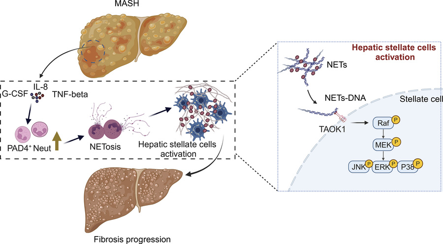 Neutrophils play a pivotal role in the progression of metabolic dysfunction–associated steatohepatitis (MASH) by mediating inflammatory responses. However, the heterogeneity of neutrophil subsets in MASH and their specific contributions to disease progression remain unclear. In this study, analysis of liver biopsies from 265 patients revealed a strong association between elevated neutrophil counts and MASH severity, particularly fibrosis. Five distinct neutrophil subsets were identified in human liver tissue, with PAD4+ neutrophils serving as key drivers in MASH progression. Mechanistically, PAD4+ neutrophils generate neutrophil extracellular traps (NETs) and activate hepatic stellate cells via the TAOK1-dependent MAPK signaling pathway. Inhibition of PAD4+ neutrophils in vivo attenuated the progression of liver fibrosis without exacerbating liver injury. Collectively, these findings elucidate the pivotal involvement of PAD4+ neutrophils in MASH progression and identify them as promising therapeutic targets for mitigating fibrosis and inflammation.