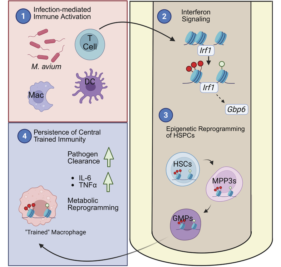Infection leads to durable cell-autonomous changes in hematopoietic stem and progenitor cells (HSPCs), resulting in production of innate immune cells with heightened immunity. The mechanisms underlying this phenomenon, termed central trained immunity, remain poorly understood. We hypothesized that infection induces histone modifications leading to changes in chromatin accessibility that are conserved during differentiation from HSPCs to myeloid progenitors and monocytes. We conducted genome-wide surveillance of histone marks H3K27ac and H3K4me3 and chromatin accessibility in hematopoietic stem cells, multipotent progenitor 3, granulocyte-monocyte progenitors, and monocytes and macrophages of naive and Mycobacterium avium–infected mice. IFN signaling pathways and related transcription factor binding motifs including IRFs, NF-κB, and CEBP showed increased activating histone marks and chromatin accessibility across cell types. However, histone marks and increased chromatin accessibility were conserved at only a few loci, notably Irf1 and Gbp6. Knock out of IRF1 disrupted enhanced mitochondrial respiration and bacterial killing in human monocyte cell lines, while GBP6-KO monocyte cell lines showed dysregulated mitochondrial respiration. In summary, this study identifies IRF1 and GBP6 as 2 key loci at which infection-induced systemic inflammation leads to epigenetic changes that are conserved from HSPCs to downstream monocytes, providing a mechanistic avenue for central trained immunity.