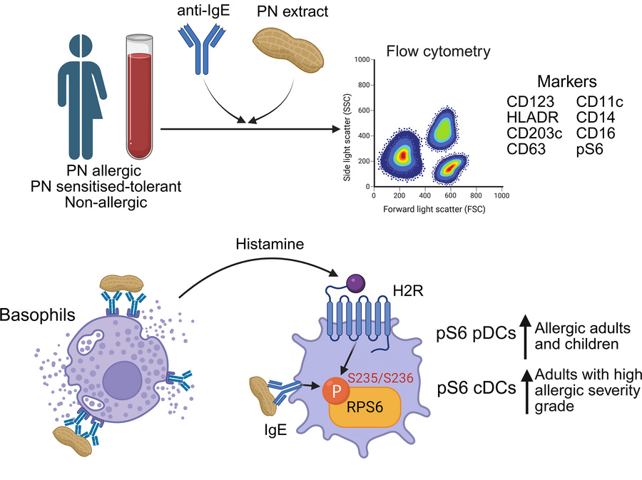The phosphorylation of the ribosomal protein S6 (RPS6) was reported to be increased in myeloid cell subsets after stimulation with peanut extract in peanut-allergic individuals or with anti-IgE antibodies in both allergic and nonallergic donors. The mechanisms driving this increase of RPS6 phosphorylation (pS6) and its clinical impacts remain to be elucidated. Therefore, we investigated the mechanism of pS6 induction in plasmacytoid DCs (pDCs) and conventional DCs (cDCs) using whole blood stimulated with peanut extract or anti-IgE antibodies. This approach included in vitro basophil depletion and the application of receptor antagonists. Clinical associations with differential pS6 were performed with data from a well-defined cohort of peanut-allergic individuals participating in the food intervention trial TINA. Our findings revealed an increase of pS6 in pDCs and cDCs via histamine receptor 2 (H2R) signaling after IgE-dependent basophil degranulation and histamine release. In adults — but not in children — pS6 in cDCs was positively associated with food allergy severity, as determined by titrated oral food challenges. The association of pS6 in cDCs with food allergy severity in an age-dependent manner suggests a possibly novel functional mechanism, which may contribute to the course of food allergy, e.g., via increased antigen presentation.