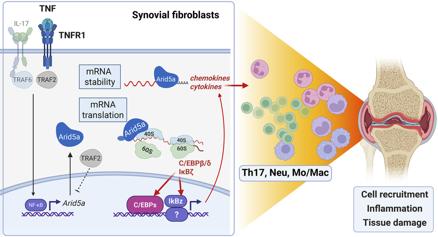 Rheumatoid arthritis (RA) is characterized by joint inflammation and bone erosion. Understanding cytokine pathways, particularly those targeting TNF, is crucial for understanding pathology and advancing treatment development. Arid5a is a noncanonical RNA binding protein (RBP) that augments inflammation through stabilizing proinflammatory mRNAs and enhancing protein translation. We examined published datasets for ARID5A in human RA blood, T cells, and synovial tissues. A stromal cell line, epithelial cells, and primary synovial fibroblasts were used to assess the effect of TNF on Arid5a expression, localization, and function. To determine how TNF induces Arid5a, WT or Traf2–/– stromal cells were treated with NIK or IKK inhibitors. To evaluate the necessity of Arid5a in arthritis progression, Arid5a–/– mice were subjected to collagen-induced arthritis. ARID5A was elevated in patients with RA and reduced by anti-TNF therapy. TNF upregulated Arid5a through the NF-κB1/TRAF2 pathway, causing cytoplasmic relocalization. Arid5a stabilized proinflammatory transcripts and enhanced expression of chemokines that drive RA. Arid5a–/– mice were resistant to collagen-induced arthritis correlating with reduced Th17 cells in synovial tissue. Thus, Arid5a serves as a newly recognized signaling intermediate downstream of TNF that is elevated in human RA and drives pathology in murine CIA, potentially positioning this RBP as a possible therapeutic target.