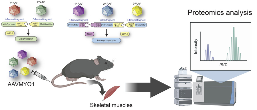 Duchenne muscular dystrophy (DMD) is a fatal genetic muscle-wasting disease characterized by loss of dystrophin protein. Therapeutic attempts to restore a functional copy of dystrophin to striated muscle are under active development, and many utilize adeno-associated viral (AAV) vectors. However, the limited cargo capacity of AAVs precludes delivery of full-length dystrophin, a 427 kDa protein, to target tissues. Recently, we developed a method to express large dystrophin constructs using the protein trans-splicing mechanism mediated by split inteins and myotropic AAV vectors. The efficacy of this approach to restore muscle function in mdx4cv mice was previously assessed using histology, dystrophin immunolabeling, and Western blotting. Here, we expand our molecular characterization of dystrophin constructs with variable lengths using a mass spectrometry–based proteomics approach, providing insight into unique protein expression profiles in skeletal muscles of wild-type, dystrophic mdx4cv, and AAV-treated mdx4cv mice. Our data reveal several affected cellular processes in mdx4cv skeletal muscles with changes in the expression profiles of key proteins to muscle homeostasis, whereas successful expression of dystrophin constructs results in an intermediate to complete restoration. This study highlights several biomarkers that could be used in future preclinical or clinical studies to evaluate the effectiveness of therapeutic strategies.