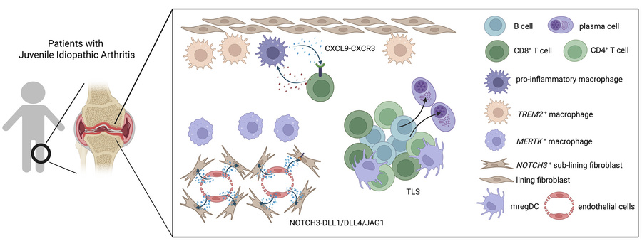 Juvenile idiopathic arthritis (JIA) is the most prevalent chronic inflammatory arthritis of childhood, yet the spatial organization in the synovium remains poorly understood. Here, we perform subcellular-resolution spatial transcriptomic profiling of synovial tissue from patients with active JIA. We identify diverse immune and stromal cell populations and reconstruct spatially defined cellular niches. Applying a newly developed spatial colocalization analysis pipeline, we uncover microanatomical structures, including endothelial-fibroblast interactions mediated by NOTCH signaling, and a CXCL9/CXCR3 signaling axis between inflammatory macrophages and CD8+ T cells, alongside the characterization of other resident macrophage subsets. We also detect and characterize tertiary lymphoid structures marked by CXCL13/CXCR5 and CCL19-mediated signaling from Tph cells and immunoregulatory DCs, analogous to those observed in other autoimmune diseases. Finally, comparative analysis with rheumatoid arthritis reveals JIA-enriched cell states, including NOTCH3+ and CXCL12+ sublining fibroblasts, suggesting potentially differential inflammatory programs in pediatric versus adult arthritis. These findings provide a spatially resolved molecular framework of JIA synovitis and introduce a generalizable computational pipeline for spatial colocalization analysis in tissue inflammation.