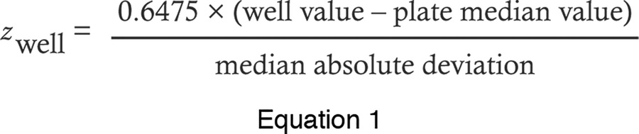 Data obtained from the custom analysis module were visualized and analyzed using the Vanderbilt High Throughput Screening Core Facility’s data visualization system Waveguide in conjunction with BIOVIA Pipeline Pilot (Dassault Systemes). Robust z score (a median-based modified z score) (49–51) was calculated for each compound with the following equation: