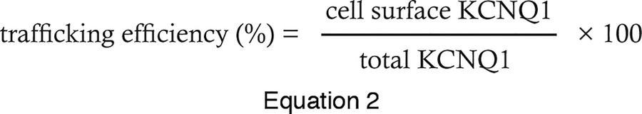 Flow cytometry analysis was conducted using a 5-laser BD LSRFortessa flow cytometer (BD Biosciences). Compensation was determined using unstained cells and single-color controls described above. Gates were drawn to select single cells that were mCherry positive (for LLP-int cell lines) or EGFP positive (for transiently transfected cells). Alexa Fluor 647 and Alexa Fluor 488 (LLP-int cell lines) or PE (transiently transfected cells) fluorescence intensities were then quantified for 2,500 cells per sample. Single-cell data were exported using FlowJo data analysis software and used to calculate average cell surface KCNQ1, total KCNQ1, and KCNQ1 trafficking efficiency. The trafficking efficiency was calculated with the following equation: